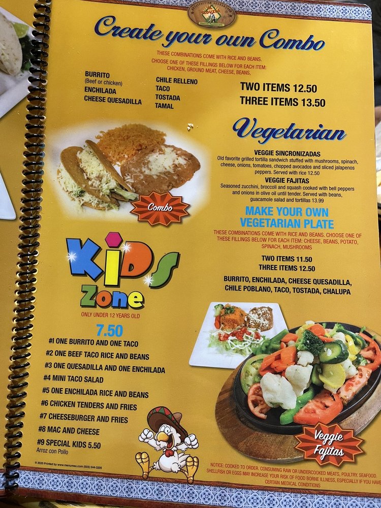 Choose two from a diverse array of classic Mexican items: burritos, enchiladas, quesadillas, chile relleno, tacos, tostadas, tamales. Options include beef, chicken, ground meat, cheese, or beans.